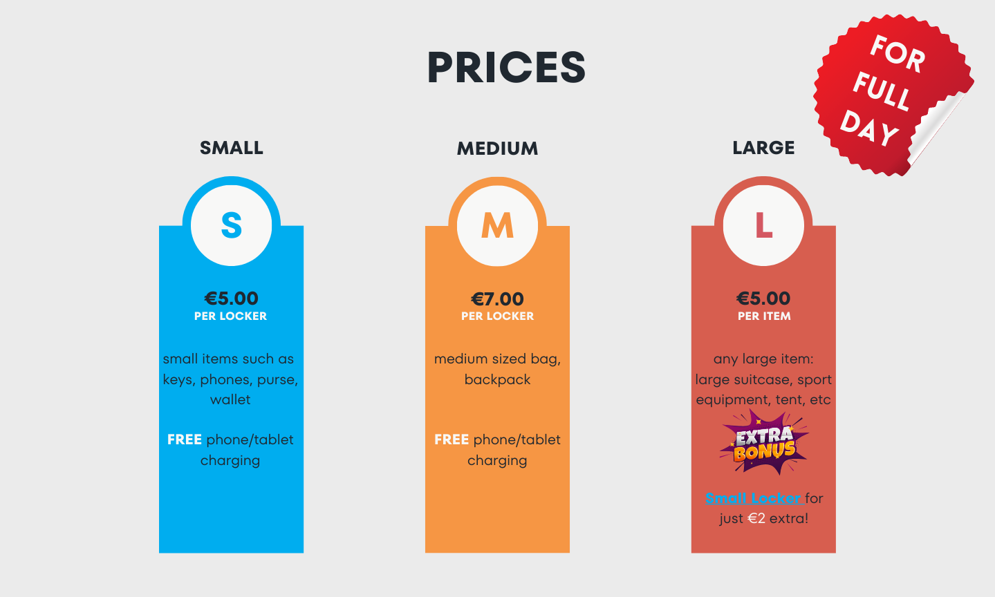 Our prices start at just €5 FOR A FULL DAY! What's more, one group can store all their items in one locker, without paying extra!